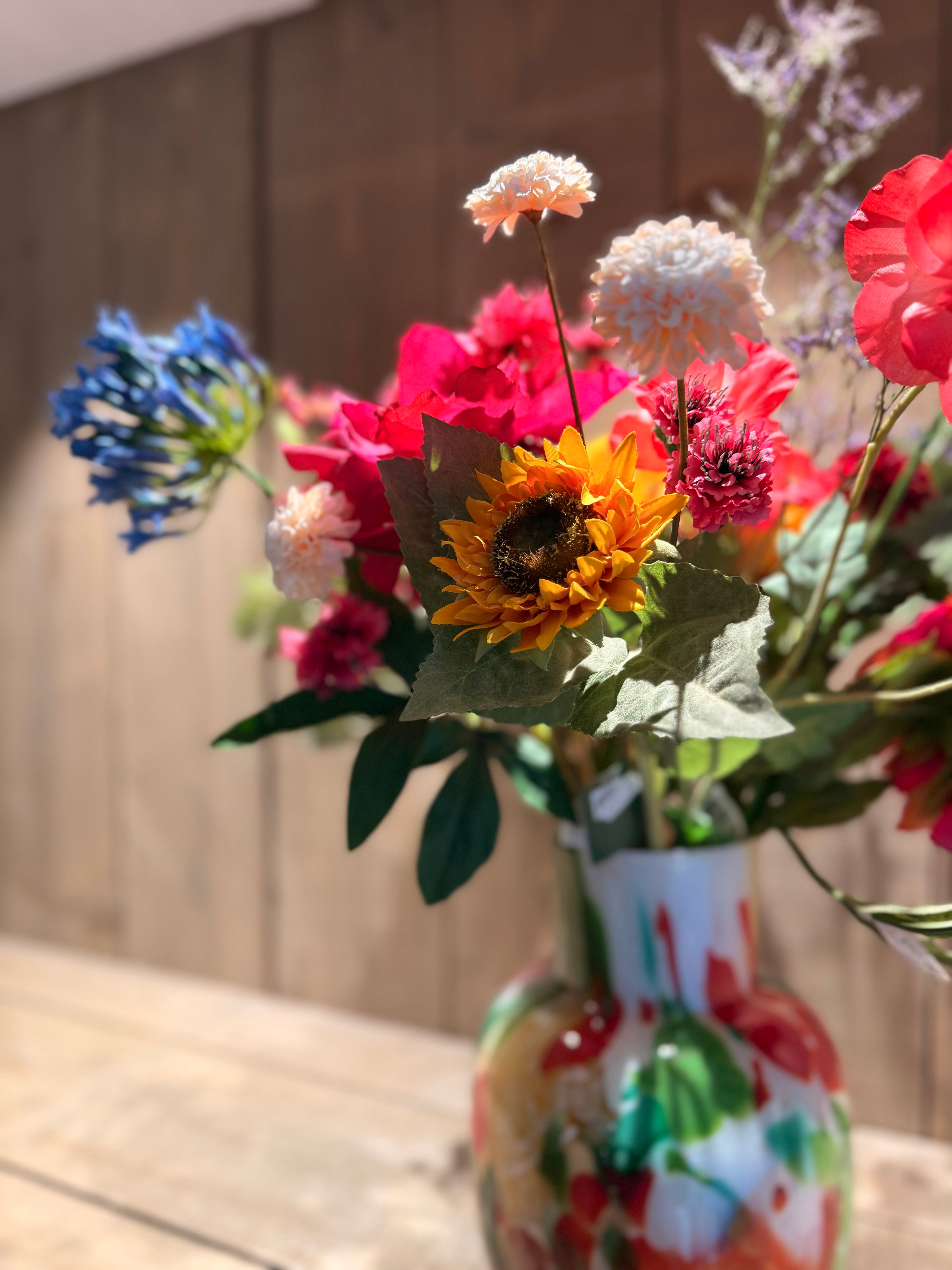 Boeket met kwaliteitsvolle zijdebloemen gemaakt in een sfeervolle vaas.